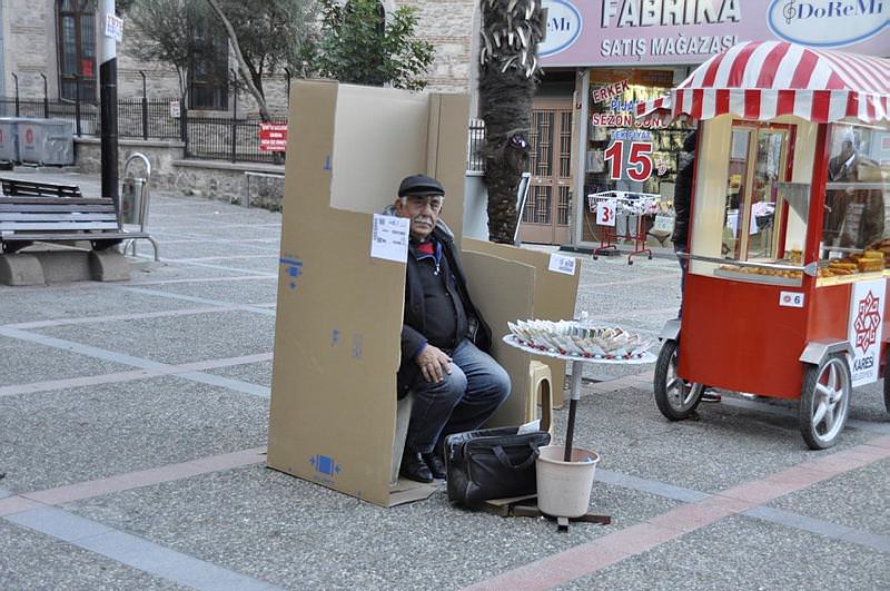 Milli Piyango bileti satıcısı 68 yaşındaki Halil Adıgül, soğuktan korunmak için ilginç bir yola başvurdu. Mukavvaları keserek kendine barınak yapan Adıgül'ün sığınağı caddeden geçen vatandaşların ilgisini çekiyor. Yıldırım Mahallesi Pınar Sokağı üzerinde bilet satarak geçimini sağlayan Adıgül, havaların çok soğuduğunu belirterek, "Üşümemek için böyle bir çare buldum. Mukavvalar rüzgarı kesiyor" dedi.