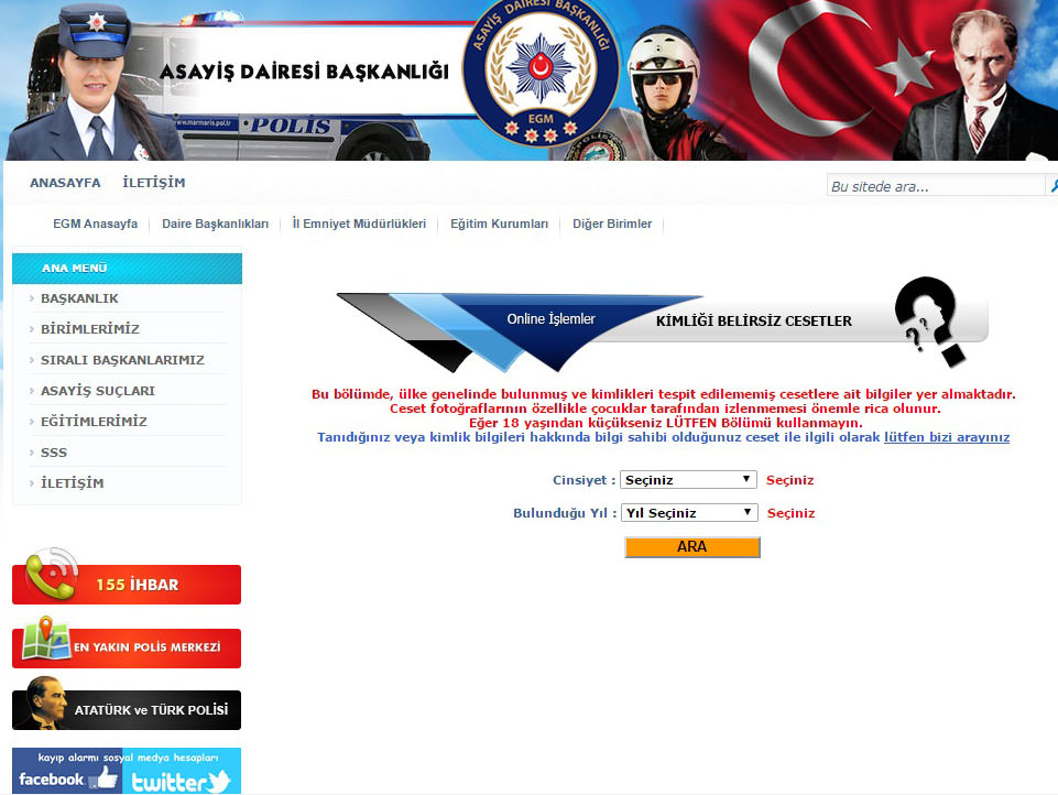 Emniyet Genel Müdürlüğü (EGM), kimliği belirlenemeyen cesetlere ait bilgileri internet sitesinde yayımlayarak, teşhis edenlerin yetkililere başvurmasını istiyor. EGM'nin internet sitesindeki "Kimliği Belirsiz Ceset Sorgulama" bölümünde, 1990'dan bu yana bulunan ancak kimliği belirlenemeyen cesetlere ilişkin albümler yer alıyor. Albümlerde, cesetlere ilişkin fotoğrafların yanı sıra bulunduğu yer ve tarih, ölüm zamanı, cinsiyeti ve tahmini yaş bilgileri yer alıyor.
