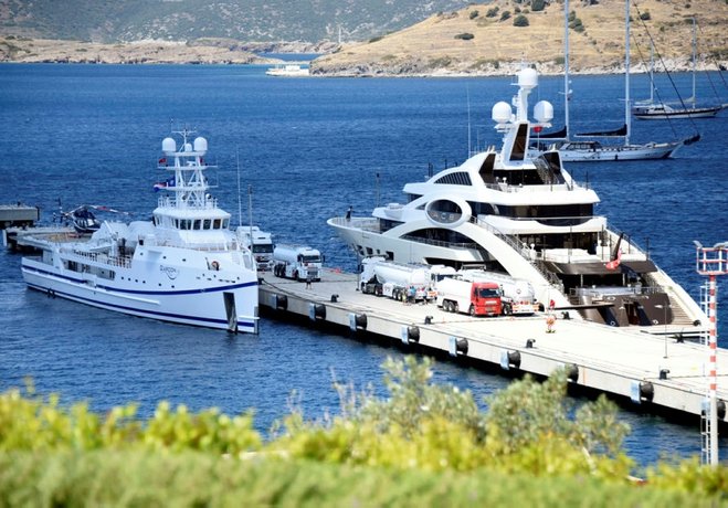 Bodrum ilçesine gelen ve üzerinde helikopter de bulunan iki süper lüks yata, 9 tanker yakıt ikmali yapıldı.