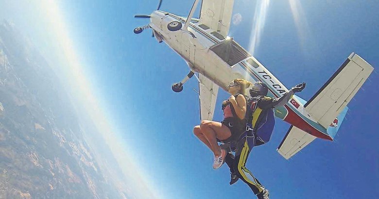 Türkiye'deki tek serbest paraşüt atlayış merkezi olan Efes Türk Hava Kurumu Paraşüt Okulu, bayram tatilini fırsat bilen adrenalin tutkunlarıyla dolup taşıyor. Maceraperestler, 12 bin fit yükseklikteki paraşüt uçağından tandem atlayışı yaparak, hem eğleniyor hem de renkli görüntüler oluşturuyor. Atlayışlar ikişer kişi halinde eğitimciyle yapılıyor. Eğitimci Muammer Evci, bayram tatili nedeniyle katılımın en üst düzeye çıktığını belirterek, "Katılımcıları önümüze bağlayarak paraşüt uçağı ile 12 bin fite çıkıyoruz. Öncelikle 45 saniye serbest düşüş yapıyoruz. Süratimiz 220-240 kilometreye ulaştığında paraşütümüzü açıyoruz ve Efes Havaalanı üzerine inişimizi gerçekleştiriyoruz" dedi.