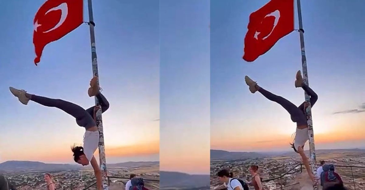 UNESCO Dünya Kültürel ve Doğal Mirası Listesi'nde yer alan Kapadokya bölgesinin önemli destinasyonları arasında yer alan Uçhisar Kalesi'nin zirvesinde yabancı bir turist, Türk bayrağı direğine uygunsuz hareketlerde bulundu.
