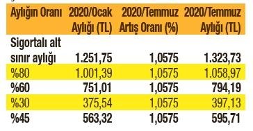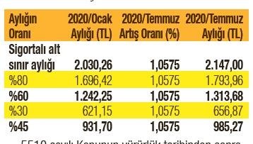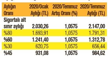 5510 sayılı Kanunun 55'inci maddesinde "bağlanan gelir ve aylıkların her yılın Ocak ve Temmuz ödeme tarihlerinden geçerli olmak üzere, bir önceki altı aylık döneme göre Türkiye İstatistik Kurumu tarafından açıklanan en son temel yıllı tüketici fiyatları genel indeksindeki değişim oranı kadar arttırılarak ödeneceği" belirtilmiş olup, 2020/Ocak-Haziran süresi TÜFE oranı TUİK tarafından % 5,75 olarak belirlenmiştir. Yaşlılık aylığı almakta olan emeklilerin mevcut aylıkları üzerinden %5,75 zamlı aylıklarını Temmuz ayında bayram ikramiyeleri ile birlikte alabileceklerdir. Bunun dışında hak sahiplerine ödenecek olan alt sınır aylıkları da aşağıdaki şekilde değişmiştir.