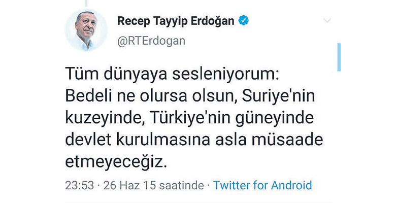 Başkan Recep Tayyip Erdoğan, sizinle paylaştığım bu tweeti 26 Haziran 2015'te yazmış ve tüm dünyaya bedeli ne olursa olsun güney sınırlarımızda bir terör devleti kurdurmayacağımızı ilan etmişti...