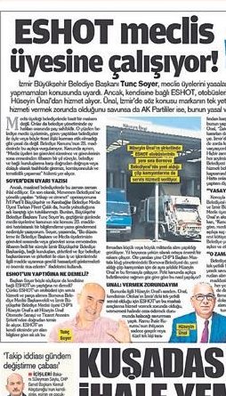 Bornova Belediyesi Meclis Başkanvekili ve Büyükşehir Belediye Meclis Üyesi olan Hüseyin Ünal'ın ismini taşıyan şirketi ile kanunen yasak olmasına rağmen ESHOT'a mal sattığını 2020 yılında bu köşede deşifre ettik. Nitekim bizim o tarihte yüzbinlerce lirayı bulan bu ticareti deşifre etmemizin ardından İçişleri Bakanlığı Ünal ile ilgili soruşturma izni verdi.