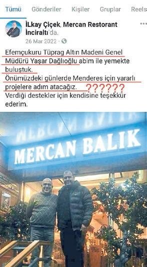 Elimize ulaşan bu görsellere göre, ikinci şıkkın doğru olduğu anlaşılıyor. CHP'nin Menderes Belediye Başkan adayı gösterdiği İlkay Çiçek, buradaki altın madenini işleten Kanadalı şirketin Türkiye ayağı Tüprag'ın yakın dostu çıktı.