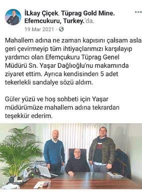 Çiçek'in Tüprag Yönetim Kurulu Başkan Yardımcısı Yaşar Dağlıoğlu ile samimi fotoğraflarına yer verdiği ve "Ne talep etsek veriyorlar" ve "Menderes için yararlı projelere adım atacağız" dediği paylaşımları bulunuyor. Ne diyelim? Halka karşı iki yüzlü davranırsanız bir gün gelir böyle deşifre olursunuz! Bu arada insanın aklına, "CHP'ye İlkay Çiçek'i Menderes'te belediye başkan adayı yaptıran güç de sakın Tüprag olmasın" kuşkusu da düşmüyor değil...