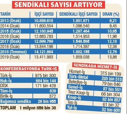 Aile, Çalışma ve Sosyal Hizmetler Bakanlığı'nın 31 Ocak 2019'da Resmi gazetede yayımlanan tebliğine göre, sendikalı işçi sayısı 1 milyon 859 bine ve resmi sendikalaşma oranı da yüzde 13.86'ya yükseldi.