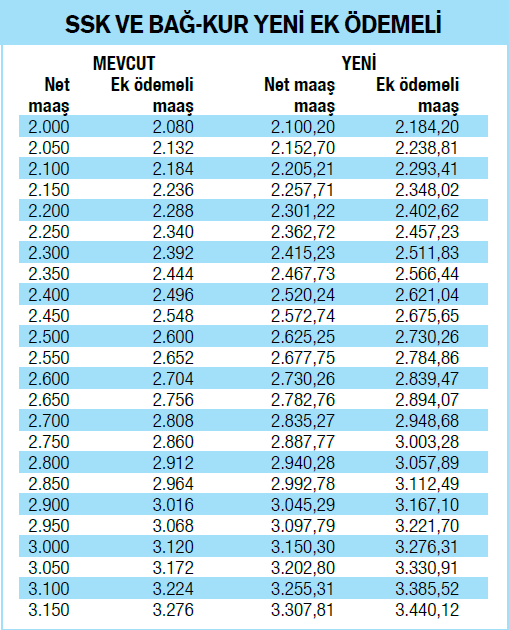 Yüzde 4 ek ödemesi ise 84 liraya çıkacak. Böylece bankaya yatacak para 2.080 liradan 2.184,2 liraya yükselecek.