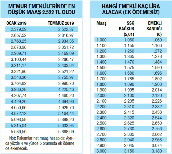 Haziran ayı enflasyonunun açıklanmasıyla birlikte yaklaşık 15 milyon emekli ve memurun Temmuz 2019 maaşları da belli oldu. Böylece SSK ve Bağ- Kur emeklileri yüzde 5,01 zam alırken, memur ve memur emeklileri de yüzde 1,0 enflasyon farkı ve bunun üzerine de eklenen yüzde 5,0'lık toplu sözleşme zammı alacak. Böylece memurlar ve memur emeklileri yüzde 6 zam almış olacak.