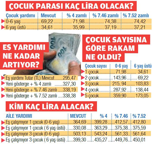 Ocak'ta çocuk yardımları da memur maaş katsayısındaki artışla zamlanacak. 0-6 yaş arası için çocuk yardımı en az 71,98 liraya, enflasyon tahminlerine göre de 74 liraya çıkabilecek. 6 yaş üstü çocuklar için ödenen tutar ise en az 35,99 liraya, enflasyon tahminlerine göre 37 liraya yükselebilecek.