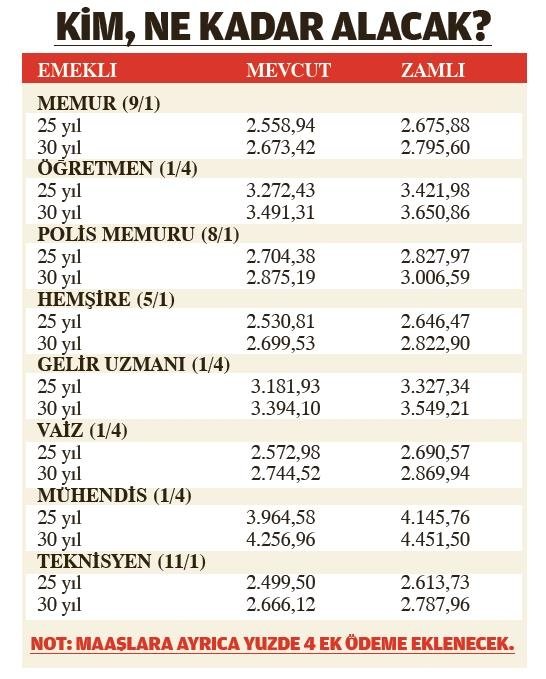 Yüzde 4.57'lik orana göre, aile yardımı hariç en düşük maaş 3 bin 517 liradan 3 bin 677 liraya yükselecek. Eş yardımı 332 liradan 347,17 liraya, çocuk yardımı da 0-6 yaş arası için 73,04 liradan 76,38, üstü için 36,52 liradan 38,19 liraya çıkacak. Eşi çalışmayan, 0-6 yaş arası 2 çocuğu olan memur 478,08 lira alırken, bu tutar 499,93 liraya yükselecek.