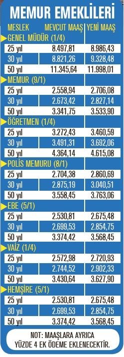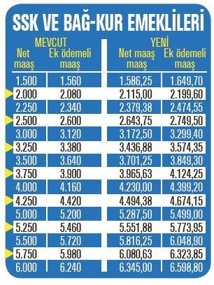 Buna göre 2000 lira maaşı olan bir emekli şu anda 80 lira ek ödeme alırken yeni zamla birlikte maaşı 2.115 liraya, ek ödemesi de 84 lira 60 kuruşa çıkmış olacak. böylece bu emeklinin eline daha önce 2080 lira geçerken şimdi hesabına 2.1999 lira 60 kuruş yatırılacak.