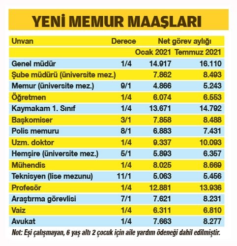 HAZİRAN enflasyonunun açıklanmasıyla birlikte memur maaşları da değişti. Buna göre memurlar yüzde 3 toplu sözleşme zammına ilaveten yüzde 5.45 oranında enflasyon farkı da alacaklar. Böylece en düşük memur maaşı aile yardımı hariç 4.330 TL'ye çıkmış olacak.
