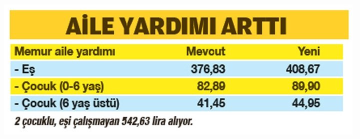 ENFLASYON rakamlarının açıklanmasıyla milyonlarca memur ve emekli ile birlikte sosyal yardım alanların maaşları değişti. Memurlarda zam yüzde 3+5.45 şeklinde uygulanacak. Böylece memurlar yüzde 3 toplu sözleşme zammına ilaveten yüzde 5.45 oranında enflasyon farkı almıaş olacak. Toplam zam oranı da yüzde 8.45 olacak. En düşük memur maaşı aile yardımı hariç 4.330 TL'ye yükselirken en düşük emekli memur maaşı da 3.276 lira olacak. Memurların aldığı aile yardımları da artacak. Buna göre eş yardımı 409 TL, 0-6 yaş çocuk yardımı 90, 6 yaş üstü çocuk yardımı ise 46 liraya çıkacak. 6 yaş altı 2 çocuğu olan, eşi çalışmayan memur aylık 589 lira alacak.