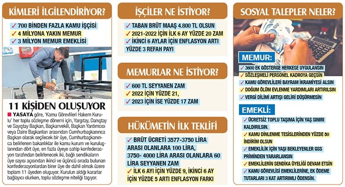 Memurlar ve memur emeklilerini ilgilendiren toplu sözleşme görüşmeleri ise Ağustos ayı ile birlikte başladı. İlk toplantıda memur sendikaları tekliflerini sunmuşlardı. Ardından hizmet kollarıyla ilgili görüşmelere geçildi ve her sektör için ayrı ayrı talepler alınarak ön protokoller imzalandı. Bu imza altına alınan talepler üzerinden müzakereler ve pazarlıklar devam edecek. Böylece memurların ve memur emeklilerinin 2022 ile 2023 yılları için 4 ayrı zam oranı ve sosyal hakları belirlenecek. Bu yıl Memur- Sen ve Türkiye Kamu-Sen toplu sözleşme görüşmelerinde birlikte hareket ediyorlar. İki konfederasyonun ortak teklifleri de hükümete sunulmuştu. İki konfederasyon, taban aylığa 600 lira seyyanen zam, 2022'de yüzde 21, 2023'te yüzde 17, her yıl yüzde 3 olmak üzere iki yılda toplam yüzde 6 refah payı artışı talebinde bulundu. Konfederasyonların talepleri arasında tüm memurlara 3600 ek gösterge verilmesi, sözleşmelilerin kadroya geçirilmesi, memurlara da bayram ikramiyesi ödenmesi, gelir vergisinin yüzde 15'ini aşan kısmının karşılanması maddeleri de yer alıyor. Toplu sözleşme mevzuatına göre, 12 Ağustos itibariyle hükümet teklifini açıklayacak, ağustos ayının 3. haftasına kadar da müzakerelerin tamamlanması gerekecek. Eğer bu süreçte anlaşma sağlanamazsa zam oranına Hakem Kurulu karar verecek.