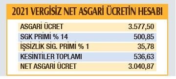BUGÜN asgari ücrette brüt rakam 3.577,50 TL. Bu rakamdan kesilen prim ve vergilerden sonra işçiye 2.528,9 TL net olarak ödeniyor. Asgari ücretli bir işçinin işverene maliyeti ise 2021 yılı için 4.203,56 TL'yi buluyor. Burada işverenin SGK primi ve işsizlik sigortası primi brüt ücrete eklenmiş oluyor. 2021 yılı asgari ücreti üzerinden bakarsak 3.577,50 TL'lik brüt asgari ücretten kesilen gelir vergisi toplamda 456,13 TL'yi buluyor. Sadece vergilerin alınmadığı düşünüldüğünde 2.825,9 TL'lik net asgari ücret bu yıl için AGİ hariç 3.040,87 TL'ye yükselmiş olacak. Vergi alınmadığı için AGİ iadesi de yapılmayacaktır. Dediğimiz gibi şu anda apartman görevlileri için zaten bu hesap ve miktar uygulanıyor..