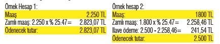Taban ücretin altında yani 2.500 TL'nin altında maaş alanlar için öncelikle yüzde 25,47 oranındaki enflasyon artışı uygulanacak. Eğer miktar 2.500 TL'nin altında kalırsa ilave yapılacak. Kalmaz ise enflasyon artışı yeterli olacak. Bunun için iki örnek hesaplama şeyle olacak: