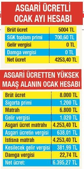 Bu yıl uygulanacak olan yeni asgari ücret hem artış oranı hem de vergisiz olması bakımlından ilkleri barındırıyor. Bu yıl 5004 liralık brüt asgari ücretten gelir ve damga vergisi alınmayacak. Sadece bu değil tüm çalışanların maaşlarından asgari ücret kadar kısım vergiden istisna tutulacak. Böylece asgari ücret alanlar damga vergisiyle 676 liralık bir vergiden muaf olurken yüksek maaş alanlar ise 638 liralık gelir vergisi istisnasından yararlanacak ve gelir vergilerinden bu kadar miktar düşülecek. Vergisiz asgari ücret ve maaşlardaki bu istisna ile birlikte bir vergi iadesi olarak uygulanan Asgari Geçim İndirimi de fiilen kalkmış oldu.