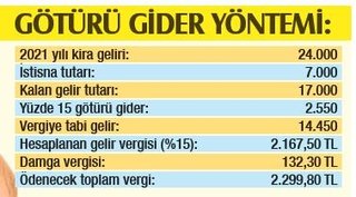- Konut kira geliri elde ederken, diğer taraftan kendisi de kirada oturanların ödedikleri kira bedelleri de (lojman kiraları dâhil) hesaplamada gider olarak dikkate alınabiliyor.