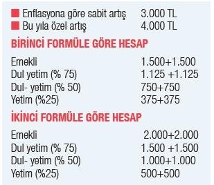 Birincisi enflasyon oranında artış yapılıp bunun kalıcı hale getirilmesi. Bu durumda yüzde 36 civarında yapılacak bir artışla ikramiye 1.500 TL olacak ve her yıl enflasyon oranında artacak. İkinci formülde ise bu yıl ikramiyenin 2.000 TL yapılması var. Önümüzdeki günlerde TBMM gündemine gelecek torba yasada bu tür bir düzenlemenin olması bekleniyor. Bu iki duruma göre hesaplar şöyle yapılacak: