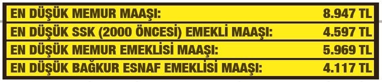 SSK ve Bağ-Kur emeklileri için de bir taban maaş belirlemesi de söz konusu olabilecek. Çalışma Bakanı Vedat Bilgin'in verdiği maliyet rakamı olan 13 milyar TL'den yapılan hesaba göre en düşük maaş 3500 ile 4000 TL arasında çıktığında 2.850 TL olan en düşük emekli maaşı da bu rakamlara tamamlanmış olacak. Memur ve memur emeklilerine 2.5 puanlık bir artış daha yapılırsa bu kez zam oranları Yüzde 41,67 olarak güncellenecek. Bu artışlar için 4 Temmuz'da açıklanacak enflasyon verisinden sonra bir değerlendirme yapılacak.