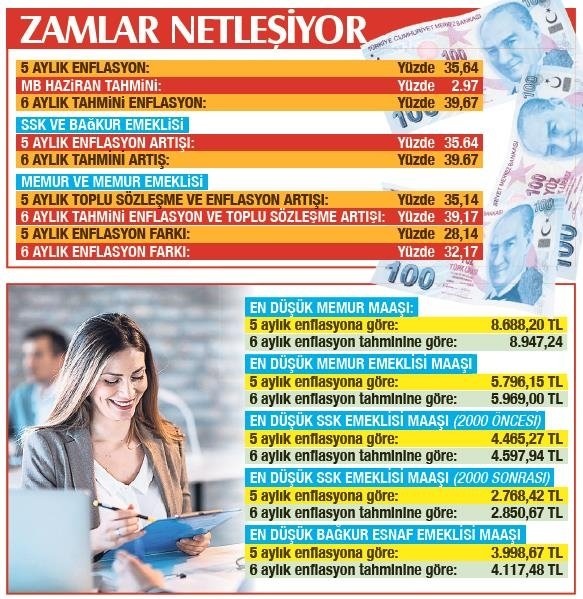 Yapılan bu hesaplamalar sonucunda yüzde 35,64'lük 5 aylık enflasyon gerçekleştiğinde en düşük maaş memurlarda 6 bin 429 liradan 8 bin 688 lira 20 kuruşa 6 aylık tahmine göre ise 8.927 lira 24 kuruşa çıkacak. En düşük emekli aylığı ise memurlarda 5 aylık enflasyona göre 4 bin 289 liradan 5 bin 796 lira 15 kuruşa, 6 aylık enflasyon tahminine göre ise 5 bin 969 liraya çıkacak.