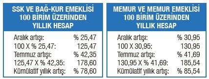 Dün açıklanan 6 aylık enflasyon oranı ile birlikte emekliler ve memurların da yılın ikinci artış oranları belli oldu. 6 aylık enflasyonun yüzde 42,35 olarak gerçekleşmesinin sonunda SSK ve Bağ-Kur emeklileri yüzde 42,35 oranında artış aldılar. Memurlar ve emekli memurlar ise enflasyon farkı ile birlikte toplu sözleşme artışı olarak yüzde 41,69 oranında Temmuz artışı aldılar. SSK ve Bağ- Kur emeklileri yılbaşında yüzde 25.47 oranında zam alırken memurlar ve memur emeklileri ise yüzde 30,95 oranında zam almışlardı. Şimdi SSK ve Bağ-Kur emeklileri ile memur emeklileri ve memurların yıllık kümülatif artışlarına bakalım.