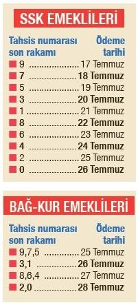 SSK ve Bağ-Kur emeklileri ise maaşlarını tahsis numaralarının son rakamına göre önümüzdeki haftadan itibaren alacaklar. SSK emeklilerinin maaşları 17 Temmuz'dan itibaren hesaplara geçmeye başlayacak. 26'sına kadar maaşlar hesaplara geçecek. Bağ-Kur emeklileri de 25-28 Temmuz'da yeni aylıklarına kavuşacak.