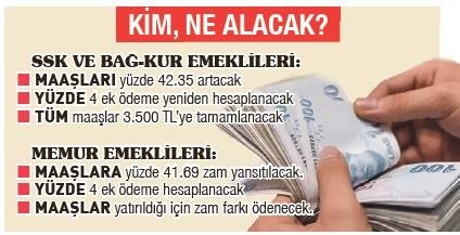 Memurlar yeni zamlı maaşlarını bayramdan önce 8 Temmuz'da aldılar. Şimdi sıra emeklilere geldi. Memur emeklilerinin maaşları 1 Temmuz ile 5 Temmuz arasında yatırıldığından zamsız olarak ödendi. Ancak memur emeklileri zam farklarını bu ay içinde açıklanacak bir takvim çerçevesinde alacaklar. Memur emeklilerine yüzde 41.69 oranında fark yatırılacak.