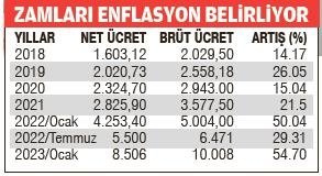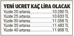Buna Haziran enflasyonu da eklenecek. Ayrıca refah payı da buna ilave ediliyor. Ancak en düşük memur maaşının 22 bin lira olması da karar bağlanacak. Burada da üç ayrı formül gündeme geldi. Şu anda aile yardımıyla birlikte en düşük memur maaşı 11.848 TL olarak uygulanıyor. Üzerinde çalışılan üç formül ise şöyle belirlendi: Birinci formüle göre 11.848 TL maaşa yüzde 90'a yakın artış yapılarak 22 bin liraya tamamlanabilir. Böylece tek bir oransal artışla taban maaş yükseltilir.