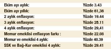 Bu güne kadar enflasyon verilerinden 4 aylık oran açıklanmıştı. Yarın açıklanacak Kasım enflasyonu ile birlikte 5 aylık oran da ortaya çıkmış olacak. Böylece emeklilerin ve memurların alacakları zam oranları biraz daha netlik kazanacak. Aralık enflasyonunun açıklanmasıyla birlikte de 6 aylık enflasyon ortaya çıkacak. Türkiye İstatistik Kurumu (TÜİK) Ekim ayı enflasyon rakamlarını açıklamış ve 4 aylık enflasyon rakamı da yüzde 29,41 olarak hesaplanmıştı. Bir başka ifade ile Haziran ayında 1351,59 olan Tüketici Fiyat Endeksi Ekim ayında 1749,11'e yükselmişti. Yüzde 29.41 oranı SSK ve Bağ-Kur emeklileri için 4 aylık enflasyon artışı anlamına gelirken memurlar ve memur emeklileri için de yüzde 22.08 oranında enflasyon farkı anlamına geliyor. Buradan yola çıkarak yüzde 15'lik toplu sözleşme artışıyla beraber memurlar ve memur emeklilerinin 4 aylık artışı yüzde 40,39'a ulaşmış oldu. Pazartesi günü açıklanacak yeni oran ile bu rakamlar da yükselmiş olacak.