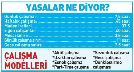 Ancak yine yasalarımızda yer alan denkleştirme yöntemi ile haftalık 45 saatlik süre mesai yapılsa da günlere bölünerek doldurulabiliyor.