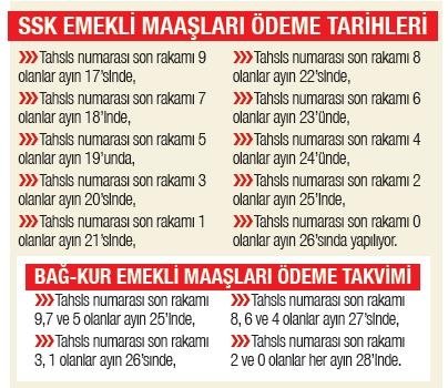Emeklilerin maaşları değişik tarihlerde ödeniyor. SSK ve Bağ-Kur'da tahsis numarasının son rakamına göre günler belirleniyor. Buna göre SSK emeklileri her ayın 17'si ile 26'sı arasında maaş alırken Bağ-Kur emeklileri 25'i ile 28'i arasında alıyor. Memur emeklileri ise her ayın 1'i ile 5'i arasında maaş alıyor. Ödeme tarihleri şöyle belirleniyor.