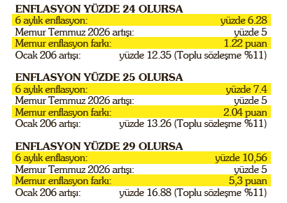 Yüzde 11 oranındaki Ocak zammına enflasyon farkı eklenmesi de kesinleşmiş oldu. Merkez Bankası 2025 enflasyonunu yüzde 25 ile 29 arasında bekliyor. Yüzde 25 tahminine göre, bu yılın ikinci yarısında enflasyon yüzde 7.14 çıkacak. Memurlar ve memur emeklileri de bu durumda 2.04 puan enflasyon farkı alacak. Ocak zammı da bu durumda yüzde 13.26'ya ulaşacak. Yüzde 29'luk tahmin ise 2025'in ikinci yarısındaki enflasyonun yüzde 10.56 çıkabileceğini gösteriyor. Bu orana göre de memurların ve memur emeklilerinin enflasyon farkı 5.3 puan olacak. Enflasyon farkıyla birlikte Ocak ayı zam oranı yüzde 16.88'e ulaşacak.