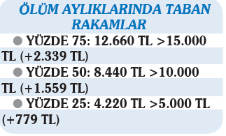Vefat eden sigortalıların eş ve çocuklarının aldıkları ölüm maaşlarıocak ve temmuz aylarında aynı oranda artırılıyor. Bu yılın ilk 6 ayı için aylıklar vefat eden sigortalı SSK ev Bağ-Kur kapsamında ise yüzde 12.19 oranında, emekli sandığı mensubu ise yüzde 18.6 oranında artırılarak ödenecek. Taban maaş uygulaması dul ve yetim maaşları için de geçerli oluyor. Burada aylık ödenmesinde uygulanan hisse oranları baz alınıyor. Hangi oranda ölüm aylığı alınıyorsa taban maaş da o oranda belirleniyor. Belirlenen rakamın altında kalan dul yetim maaşları hazine desteği ile o rakama tamamlanıyor.