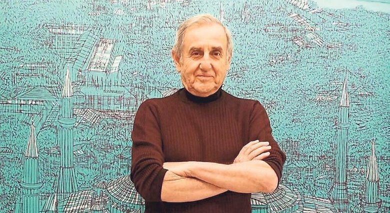 Devrim Erbil resimde şair, çizgi düzleminde şiir sunar izleyicisine.