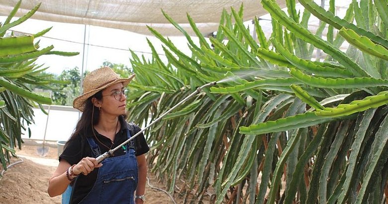 Aydın'da ilk pitaya üreticilerinden olduğunu ve ilk etapta nasıl yapacağını, kime pazarlayacağını bilmeden bu işe girdiğini anlatan Vildan Uğurlu, "İstanbul'da Uluslararası Lojistik ve Taşımacılık bölümü mezunuyum. Mezun olduktan sonra 2 sene özel sektörde lojistik departmanında çalıştım. Gayet güzel bir işim ve kariyerim vardı. Klimalı ortam, çok rahat şartlar, maaşım iyi, özel sigortam var. Her şey çok iyi ama rahat değilsiniz. Orada büyük bir koşuşturma var ve sürekli kapalı gibisiniz. Betonların içinde yaşıyorsunuz. Ailem buralı. Ben de doğma büyüme çiftçiyiz. Çiftçilikle uğraşarak büyüdük. Daha sonra istifa edip niye köyüme dönüp, kendim üretip, toprakla beraber yaşa mıyım diye bir karar aldım. Sonra istifamı verdim ve köyüme geldim. Aslında ilk geldiğimde ne yapacağıma dair hiçbir fikrim yoktu. Şunu yapacağım diye dönmedim. İstifa edeceğim kesin ama ne yapacağım konusunda ailem çiftçi olduğu için bir şekilde bir yerden başlarım şeklinde gelmiştim. Aslında ilk geldiğimde besi hayvancılığı yapmak istiyordum. Çünkü biz küçükken hayvancılık yapıyorduk. Şu an halihazırda damlarımız vardı. Besi yetiştiriciliğine dair araştırma yaparken İlçe Tarım Müdürümüz Mehmet Esen'den 'Efeler diyarında pitaya' projesi olduğunu duydum. Daha sonra ailemle biz bir araştırmaya girdik. İzmir'e Muğla'ya gittik. Farklı seraları gezdik. Sonrasında 1 dönüm için hibe proje desteği vardı eski kaymakamımızın. Onun desteğini alarak bu işe girme kararı aldık. Aydın'da aslında ilk yetiştirenlerden bir tanesi benim. Bu ürünü kime pazarlayacağız, nasıl pazarlanacak, kim yiyecek gibi bunlara dair herhangi bir fikrimiz yoktu" dedi.