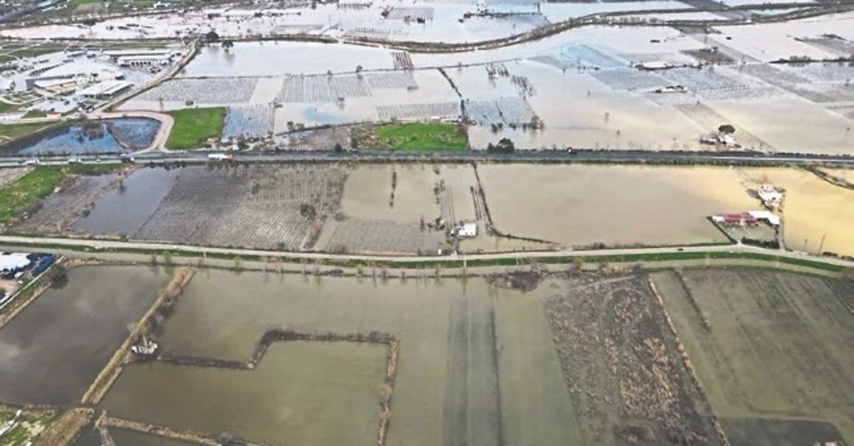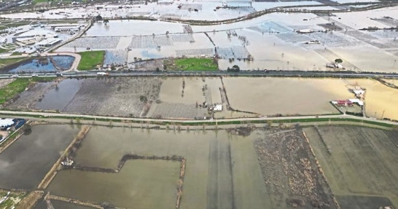 İzmir çevre yolunun ova kesimindeki yakınlarınbinlerce hektarlık alan da suyla kaplandı. Suyla kaplanan Gediz Ovası, dronla görüntülendi. Öte yandan bölgede hasar tespit çalışması başlatıldı.