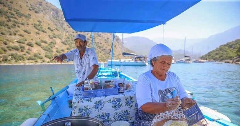 Kayaköy Mahallesi'nde oturan 73 yaşındaki Sencer Kökten, 59 yaşındaki eşi Birsen Kökten ile yoğun geçecek günün hazırlıklarına akşamdan başlıyor. Gözleme malzemelerini hazırlayan, hamurunu yoğuran Birsen Kökten, 40 yıllık hayat arkadaşının kullandığı küçük motorlu kayıkla Gemile Koyu'na açılıyor. Gün ağarmadan yola koyulan çiftin yolculuğu, Aziz Nikolas Adası çevresinde son buluyor. Bunaltıcı havaya rağmen kayıktaki tüplü sacı ısıtan, oklavasını alıp ahşap sofranın başına oturan Birsen Kökten, çevredeki yatlardan gelen siparişleri yetiştirmeye çalışıyor. Sencer Kökten de talepleri hızlıca karşılamak, siparişleri teslim etmek için çaba gösteriyor. Kayıktaki motoru kapatan ve teknelere yanaşmak için bu aşamadan sonra kürekle seyreden Kökten, güç isteyen yoğun mesaisini güneş batana kadar sürdürüyor. Gemile Koyu'nda eşiyle 25 yıldır gözleme satan Sencer Kökten, turizm sezonuyla ekmek paralarını deniz üstünde kazandıklarını söyledi. Her işin zorluğu olduğunu ancak kendilerinin severek çalıştığını anlatan Kökten, "Deniz dalgalı oluyor, rüzgar, fırtına oluyor, bazen de çok sıcak oluyor. Çalışana iş her zaman var. Artık tanınıyoruz, bizi bu koyda buluyorlar. Özel olarak gözlememizi yemeye gelenler de oluyor" diye konuştu.