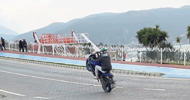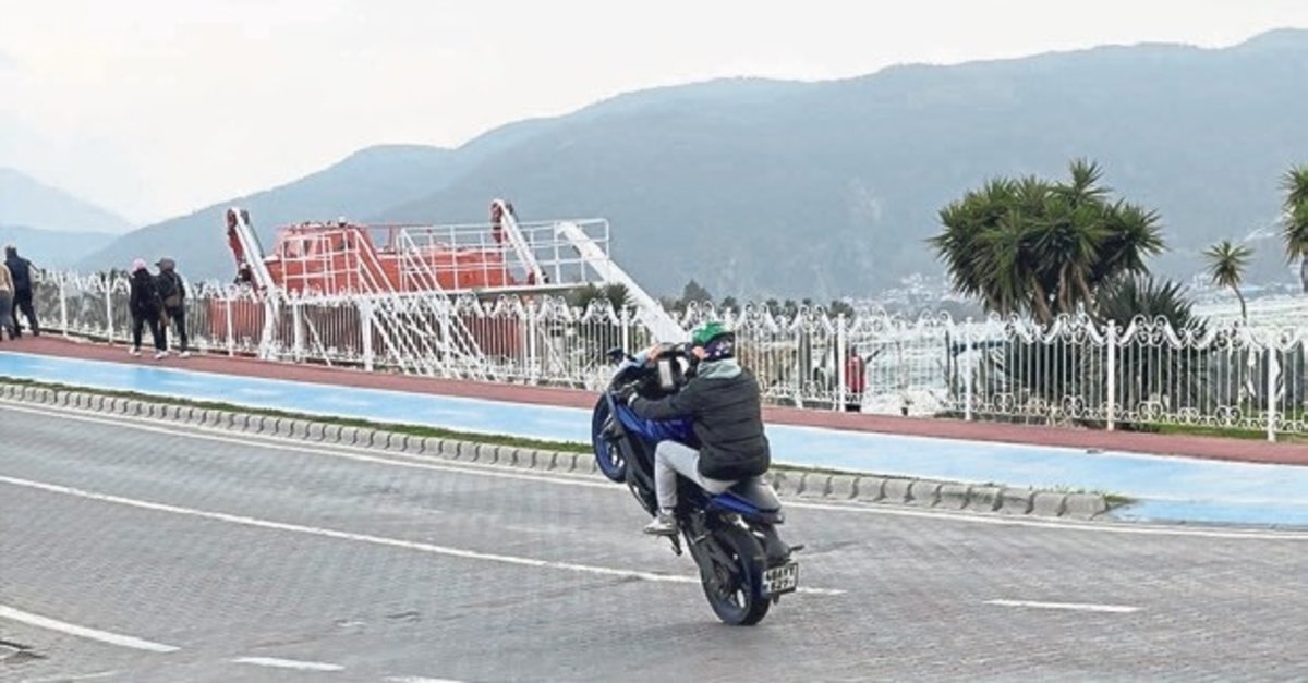 Muğla'nın Fethiye ilçesinde trafikte motosikletiyle akrobatik hareketler yapan sürücüye 3 bin 965 lira ceza kesildi. Kentte görev yapan İlçe Emniyet Müdürlüğü Trafik Büro Amirliğine bağlı sivil ekipler, bir kişinin sahil bandında motosikletiyle seyir halindeyken akrobatik hareketler yaptığını belirledi. Ekipler tarafından durdurulan ve ehliyeti iptal edilen sürücüye, 3 bin 965 lira ceza uygulandı.