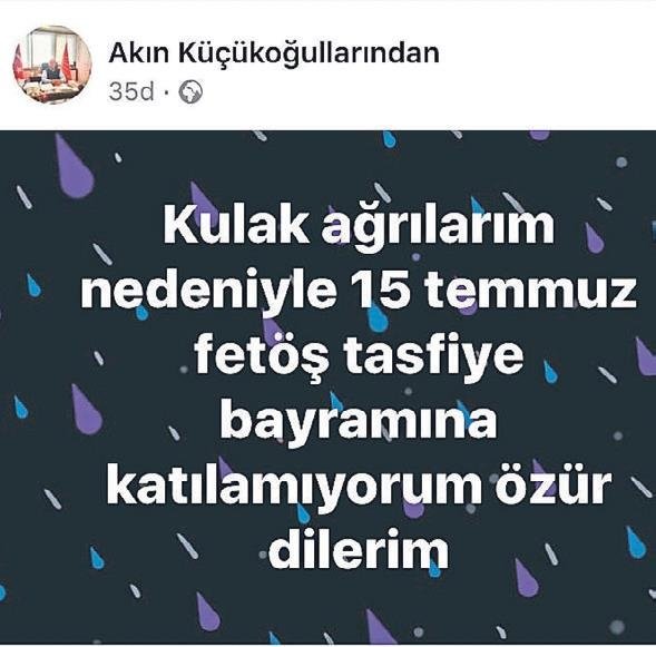 "Kulak ağrılarım nedeniyle 15 Temmuz Fetöş tasfiye bayramına katılamıyorum özür dilerim" gibi ipe sapa gelmeyen, FETÖ'nün söylemleriyle örtüşen laflar etti.