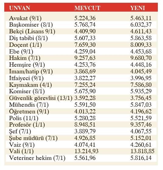 Yüzde 4.57'lik orana göre, aile yardımı hariç en düşük maaş 3 bin 517 liradan 3 bin 677 liraya yükselecek. Eş yardımı 332 liradan 347,17 liraya, çocuk yardımı da 0-6 yaş arası için 73,04 liradan 76,38, üstü için 36,52 liradan 38,19 liraya çıkacak. Eşi çalışmayan, 0-6 yaş arası 2 çocuğu olan memur 478,08 lira alırken, bu tutar 499,93 liraya yükselecek.