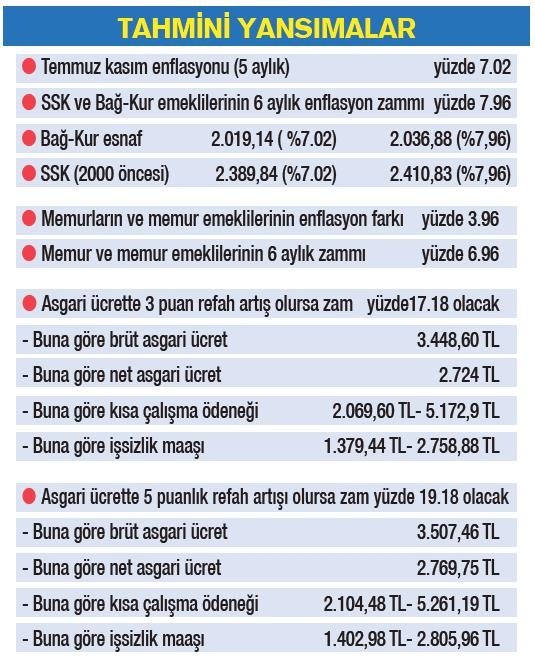 Şimdi bu rakamdan yola çıkarak bazı hesaplamalar yapalım. Eğer yıl sonunda enflasyon beklenti anketindeki gibi yüzde 14.18 çıkarsa 6 aylık enflasyon da yüzde 7.96 olarak hesaplanacak. Bu da SSK ve Bağ-Kur emeklilerinin zam oranının yüzde 7.96 olacağı anlamına geliyor. Yine memurların ve memur emeklilerinin zam oranının ise yüzde 3+3,96 olacağı ve enflasyon farkının ekleneceği de bu hesaptan ortaya çıkıyor.