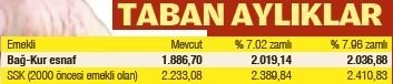 Merkez Bankası'nın anketinden yola çıkarak hesaplanan yüzde 7.96 oranına göre en düşük esnaf emeklisi aylığı tahmin gerçekleşirse bin 886 liradan 2 bin 36 liraya çıkacak. 2000'den önce emekli olan SSK'lılarda taban aylık da 2 bin 233 liradan 2 bin 410 liraya yükselecek.