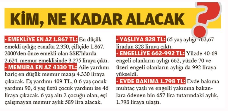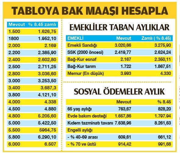 ENFLASYON rakamlarının açıklanmasıyla milyonlarca memur ve emekli ile birlikte sosyal yardım alanların maaşları değişti. Memurlarda zam yüzde 3+5.45 şeklinde uygulanacak. Böylece memurlar yüzde 3 toplu sözleşme zammına ilaveten yüzde 5.45 oranında enflasyon farkı almıaş olacak. Toplam zam oranı da yüzde 8.45 olacak. En düşük memur maaşı aile yardımı hariç 4.330 TL'ye yükselirken en düşük emekli memur maaşı da 3.276 lira olacak. Memurların aldığı aile yardımları da artacak. Buna göre eş yardımı 409 TL, 0-6 yaş çocuk yardımı 90, 6 yaş üstü çocuk yardımı ise 46 liraya çıkacak. 6 yaş altı 2 çocuğu olan, eşi çalışmayan memur aylık 589 lira alacak.