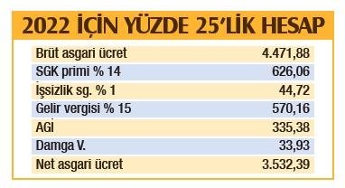 BUNU 2022 yılı için yeniden hesaplarsak rakam ne olacak ona bakalım. Asgari ücret artışının en az yüzde 25 olacağı varsayımıyla hesabı yaparsak brüt asgari ücret 4.471,88 TL'ye çıkabilecek. Bu durumda net ücret ise 3.532,38 TL'ye ulaşacak. Gelir vergisi alındığında yüzde 25 artışla asgari ücret hesabı şöyle olacak: