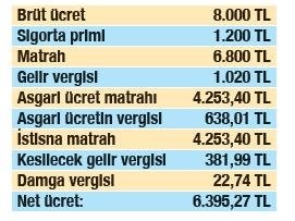 Örneğin bir işçinin brüt maaşı 8.000 TL olsun. Bu işçi asgari ücret üzerinde maaş almaktadır. Ancak ücretinde asgari ücret kadar kısım vergiden istisna tutulacaktır. Bu işçinin Ocak maaşı şöyle hesaplanacaktır: