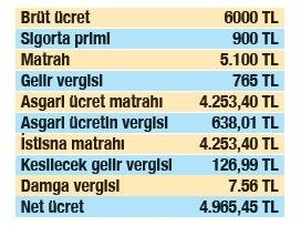 Örneğin bir işçinin asgari ücret dışında 996 lira da sosyal yardım olarak ödeneği bulunsun. Bu durumda bu işçinin brüt ücreti 6000 TL'ye çıkacak ve Ocak maaşı şu şekilde hesaplanacak: