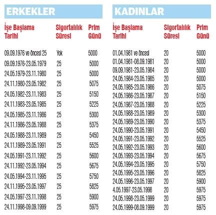EYT yasa taslağı Meclis Plan ve Bütçe Komisyonu'nda görüşülmüş ve 4 madde olarak kabul edilerek Genel Kurul'a sevk edilmişti. Düzenlemeye göre 8 Eylül 1999 öncesinde sigortalı olarak işe başlamış tüm vatandaşlar bağlı bulundukları kurumun prim şartını tamamlamaları halinde yaşa bakılmadan emekli olabilecek. Buna göre Bağ-Kur ve Emekli Sandığı mensupları erkeklerde 9 bin gün, kadınlarda ise 7 bin 200 gün prim şartını tamamlayanlar yaş şartı olmadan emekli olabilecek. SSK'lılarda ise kadın ve erkeklerde işe girdikleri tarihe göre 5000 ile 5975 gün arasında değişen prim şartını tamamlamaları halinde yaş şartı olmadan emekli olabilecek. SSK'lılarda ayrıca ilk sigorta oldukları tarihten bu yana kadınlarda 20, erkeklerde ise 25 yılın geçmiş olması gerekiyor. Burada prim gününün kaç gün olacağı işe girilen yani ilk sigorta olunan tarihe göre belirlenecek. Bunun için kadınlar ve erkekler için iki ayrı tablo da hazırlandı. Primini tamamlayan 2 milyon 250 bin EYT'li vatandaş hemen emekli olabilecek. Primi eksik olanlar ise tamamladıkları zaman yine yaş şartına bakılmadan emekliliğe hak kazanacak. Bu şekilde yaklaşık 5 milyon vatandaşın emekli olması bekleniyor. SSK'lıların tamamlamaları gereken prim şartları ise şöyle belirleniyor: