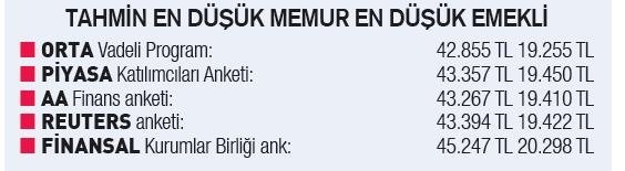 Bu yüzden haziran-Aralık arasındaki 6 aylık enflasyon verisi bu kesimlerin maaş zamlarını belirliyor. Ayrıca en düşük emekli maaşı uygulamasında da enflasyon ve yapılacak refah payı artışı etkili oluyor. Yaklaşık 8 milyon işçiyi direkt olarak ilgilendiren ancak 85 milyon vatandaş için de birçok ödeme ve borçlanmanın referansı olan asgari ücret için de enflasyon verileri önemli bir referans haline geliyor. Bu yıl tek safari ücret belirlendiği için yıl sonu enflasyon burada belirleyici hale geliyor. Yıl sonu için enflasyon tahminleri de tek tek açıklanmaya başladı. Özellikle Orta vadeli Program tahmini ile değişik kurumların yaptıkları anket sonuçları yıl sonu enflasyon oranı için önemli bilgiler veriyor. Bakıldığında yıl sonunda enflasyon tahminleri yüzde 40-49 bandında gerçekleşiyor. Bu oranlara göre tek tek maaş artışlarını ve yeni ücretleri hesapladık.